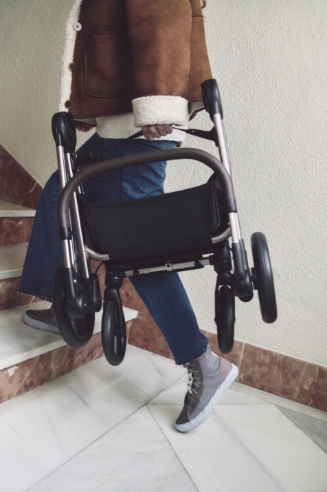 Максимална компактност, за да се побере в кола, самолет или дори килер. Сгъвате рамката заедно със седалката в двете посоки, в размер подходящ за ръчен багаж.
