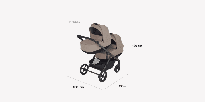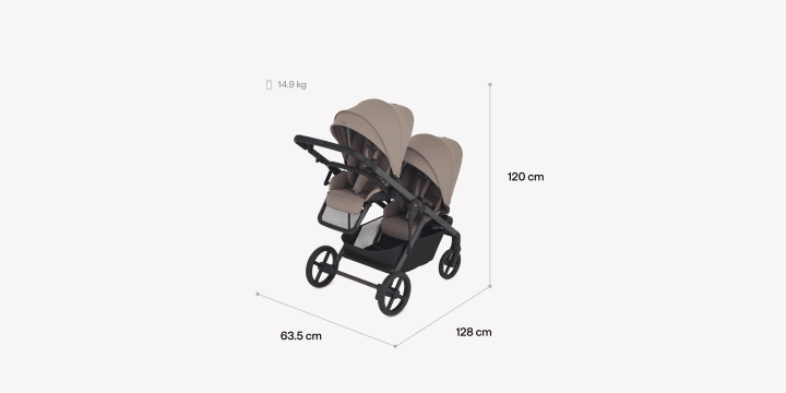 Просторна и гъвкава конфигурация за две деца (от 6 месеца до 4 години или до 22 кг всяко). Включва допълнително място за крака, опционална масичка и подвижни сенници — перфектна за активни малчугани.